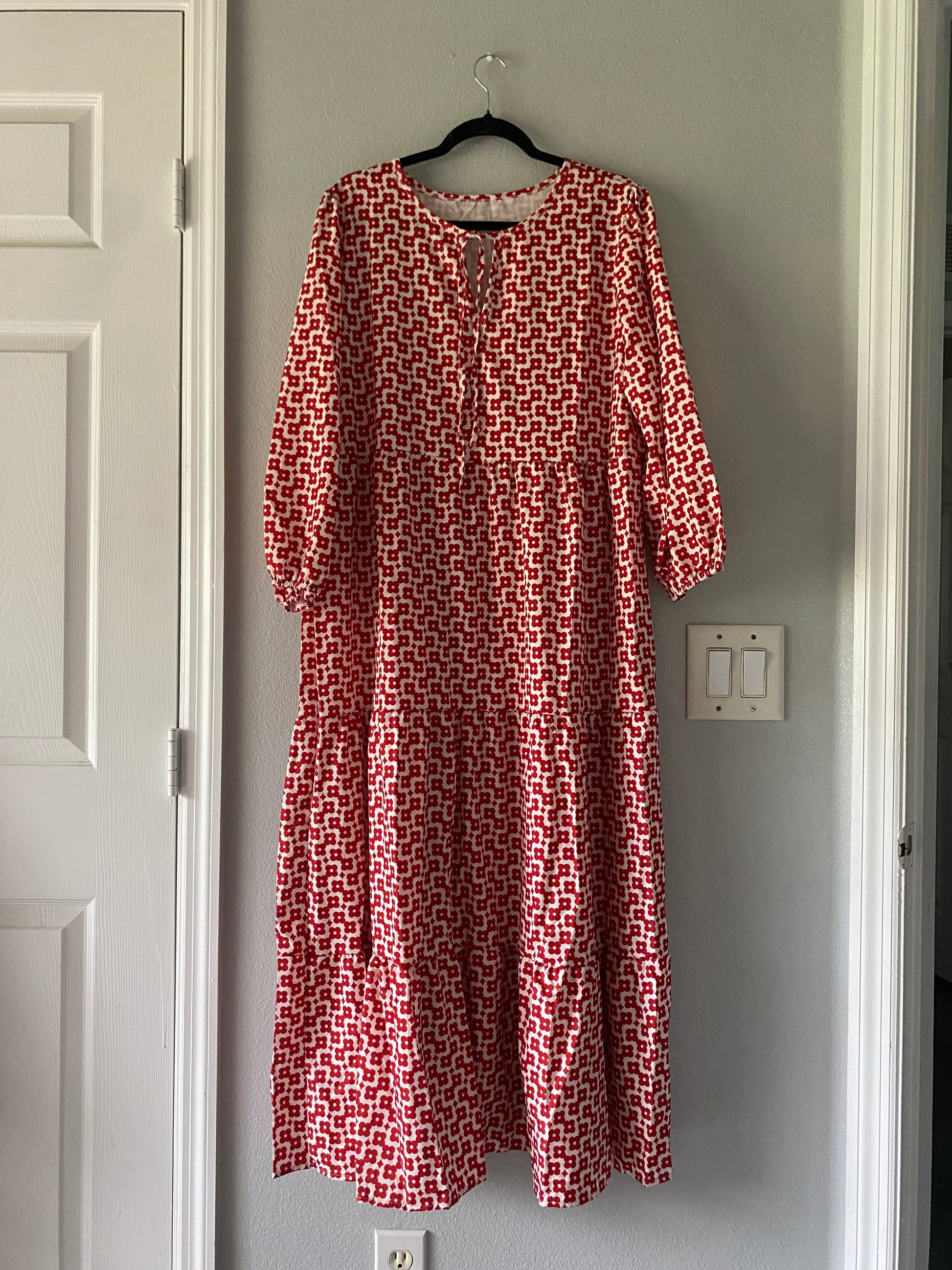 This modest red and white flower dress is perfect for any occasion. Its delicate design and vibrant colors will make you stand out in any crowd. With its comfortable fit and high-quality fabric, this dress is both stylish and practical. Add a touch of elegance to your wardrobe with this beautiful dress.